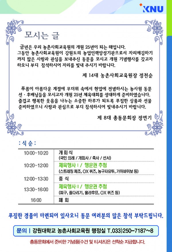 개원 25년 기념 동문체육대회 개최 안내 페이지 정보 작성자 : 관리자 날짜 : 작성일18-06-26 10:23 조회 : 17,413회 목록 본문 2018년 8월 24일(금)10시부터 농사원 개원 25년 기념 동문체육대회를 개최하고자 합니다. 자세한 내용은 초청장 참고 부탁드리며 동문여러분들의 많은 참석 부탁드립니다. 목록